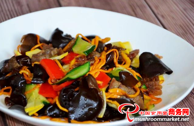 熟牛肉(可換成豬肉、雞肉等肉類)、蟲草菇、泡發的木耳、西葫蘆、黃瓜、紅色青椒、鹽、姜粉。