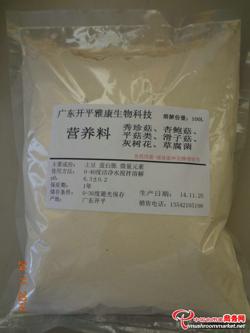 一、 本店所經營食用菌液體菌種專用培養基,各種優質原料經過嚴格篩選、測量、洗滌、調整比例、蒸煮、精細過濾提純、干燥、研磨成極細的可溶性粉末狀,嚴格的生產管理制度保證各批次的活性指標穩定,耐儲存,使用方便,培養成熟后活力強,萌發快,菌絲球單位密度極高,是理想的現代液體菌種培養基?;|為干燥粉末,滅菌器前按比例對入適量的冷水,充分攪拌溶解到無結塊,再經普通醫用單層紗布過濾后即可裝罐滅菌,滅菌后有少量沉淀為正常狀態,培養成熟后菌液澄澈,恒溫無光放置96小時后對活性無影響。