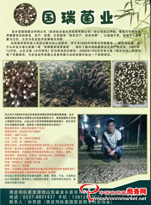 黑皮雞樅菌(特色蘑菇)------國家發明專利獲得者孫思國   。 即日起向廣大菇農大量供應雞樅菌菌種、  菌棒  以及干鮮菇產品,質量優良,確保出菇,確保產量。人心都是肉長的,用我們的真心,依靠我們真正的國家專利技術,使親愛的菇農朋友們獲得巨大的利潤! 黑皮雞樅菌菇體美麗誘人,口感潤滑甜美,富有高蛋白低脂肪,含有十八種氨基酸,極大地提高人體免疫力!所烹菜肴晶瑩剔透,就像朵朵羞澀的玫瑰,讓人們口水欲滴,流連忘返!    菌種  菌棒、  產品垂詢電話0537-8831437  手機13012937026孫思國(發明人)    網站www.sdgrsyj.com    QQ1335083178  微信765141958 國家發明專利人孫思國( 專業菌種、菌棒山東省內獨家經營,從不設分廠)  切忌上當受騙!我的技術就是您豐收的保證!期盼共獲雙贏!