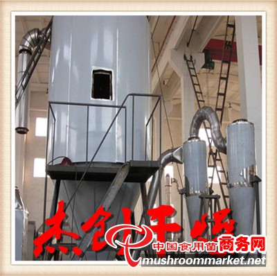 空氣經過過濾和加熱,進入干燥器頂部空氣分配器,熱空氣呈螺旋狀均勻地進入干燥室。料液經塔體頂部的高速離心霧化器,(旋轉)噴霧成極細微的霧狀液珠,與熱空氣并流接觸,在極短的時間內可干燥為成品。成品連續地由干燥塔底部和旋風分離器中輸出,廢氣由風機排空。