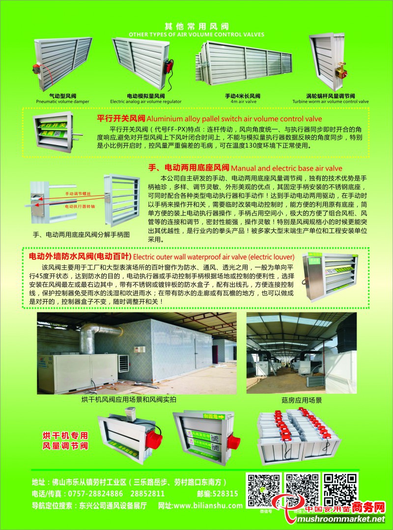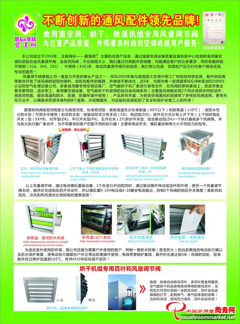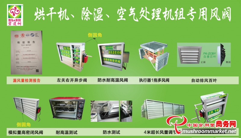 在烘干機(jī)特別是借助煤改電政策中重要的空氣能熱泵空調(diào)烘干機(jī)的出現(xiàn)后,我們公司圍繞以通風(fēng)配件為主要業(yè)務(wù),把產(chǎn)品做專、做精的核心宗旨,根據(jù)設(shè)備廠商的要求,早在2014-15年,已經(jīng)針對菇房機(jī)組,成功推出了適應(yīng)市場的雙孢菇空調(diào)設(shè)備配套的風(fēng)閥,并按國家JG/T 436-2014《建筑通風(fēng)風(fēng)量調(diào)節(jié)閥》標(biāo)準(zhǔn)進(jìn)行優(yōu)化改進(jìn),為該領(lǐng)域的廠家進(jìn)行了大量高質(zhì)量的配套同時,為配合廠家的需求,當(dāng)年曾把主營業(yè)務(wù)全部集中在該點上, 并于2018年6月,取得了國家空調(diào)設(shè)備質(zhì)量檢驗中心的漏風(fēng)量、阻力、風(fēng)量調(diào)節(jié)閥特性方面的檢驗鑒定報告,報告數(shù)據(jù)全部符合該標(biāo)準(zhǔn)我們公司也在緊密配合空氣能熱泵烘干機(jī)設(shè)備廠商,研發(fā)、改良了適合烘干機(jī)上的風(fēng)量調(diào)節(jié)閥,同時也推出了自垂百葉排風(fēng)口等一系列通風(fēng)配件,助力于食用菌市場的發(fā)展和壯大!
