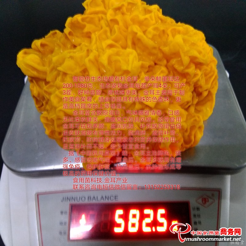 智能仿生態(tài)培植有機(jī)金耳,單朵鮮重耳達(dá)200-1080克,生態(tài)袋栽金耳每茬產(chǎn)耳4朵、可產(chǎn)3茬、好種易管、質(zhì)優(yōu)味更美。金耳主要用于制作美食菜肴、膳食保健具有特殊的色香味,更是高檔筵席的上等佳品。