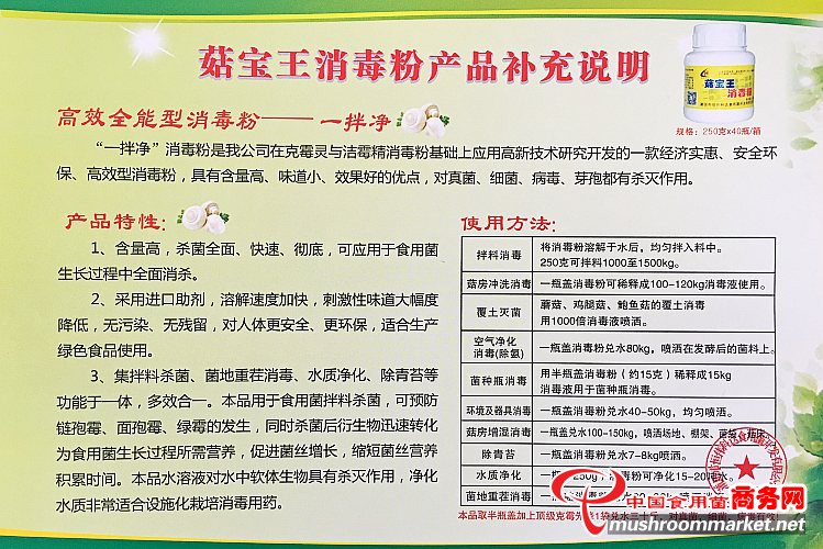 本品具有含量高、效果好的優點,對真菌、細菌、病毒、芽孢都有殺滅作用。本產品集拌料殺菌、菌地重茬消毒、水質凈化、除青苔、養殖場、疫源區滅菌消毒等功能于一體,多效合一。可預防鏈孢霉、面孢霉,綠霉的發生,同時殺菌后衍生物迅速轉化為食用菌生長過程所需營養,促進菌絲增長,縮短菌絲營養積累時間。本品水溶液對水中軟體生物具有殺滅作用,凈化水質非常適合設施化栽培消毒用藥。白堊病處理方法: 取菇寶王消毒粉3克兌水1000克直接對蜂對脾帶蜂噴霧,同時對箱內壁也噴灑。由于氣味重,蜂會掉地,應當快提快噴快放回箱,小心蜂王掉地上遺失。但是,蜂不會中毒,不會傷蜂。對大小蜂螨有驅趕的作用。蜂群每月噴藥1次,百病不生,子脾成版,效果明顯。(養殖場地養蜂場也可以撒粉消毒)