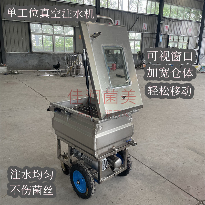 長期有效真空負壓注水機采用獨特的密封式水箱設計,全不銹鋼箱體,使用真空泵抽取水箱及菌棒內的空氣,使水箱內達到一定真空值,從而使水向菌棒內滲透,同時可根據(jù)菌棒不同設置負壓值,控制開閥時間來達到菌棒的最佳補水效果,注水均勻,不傷菌絲,能確保菌棒更充分吸收水分,很好的解決了老款注水機在第三.第四茬注水過程中注水時間長,水分難吸收易流失表面硬等問題,速度快,一個箱體可放8-12棒,自動注水,自動前進后退等特點。