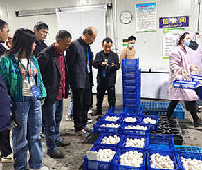 第一站,參會代表來到洛陽菘田農業開發有限公司工廠化出菇房,看到正在出菇的雙孢蘑菇。洛陽菘田農業開發有限公司負責人向與會代表詳細介紹了公司發展情況。